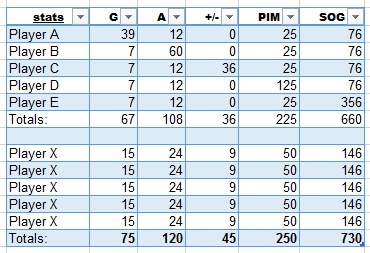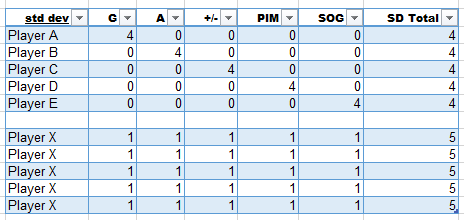 Here’s an example pulling numbers from the real world to illustrate that this can work using five scoring categories, G/A/plus-minus/PIM/SOG. Let’s take 5 players (call them Player A through E) who excel in only one category, and we’ll give them an std dev value of 4 in that category. They are perfectly average in every other category, earning them a zero std dev value in those. Each player therefore has a total std dev value of 4 across all categories. We’ll compare them to a team comprised of five copies of Player X, who is one standard deviation better than average (std dev value of 1) in every category. This player therefore has a total std dev value of 5 across all categories. The table below shows what the data would look like if you pulled up their std dev value from Yahoo.
